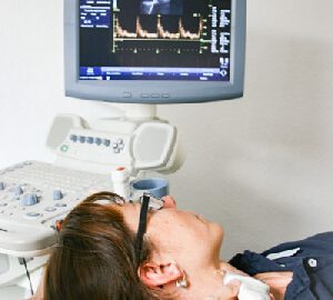 Mit Ultraschall wird der Blutfluß in den hirnversorgenden Blutgefäßen am Hals und im Gehirn überprüft....